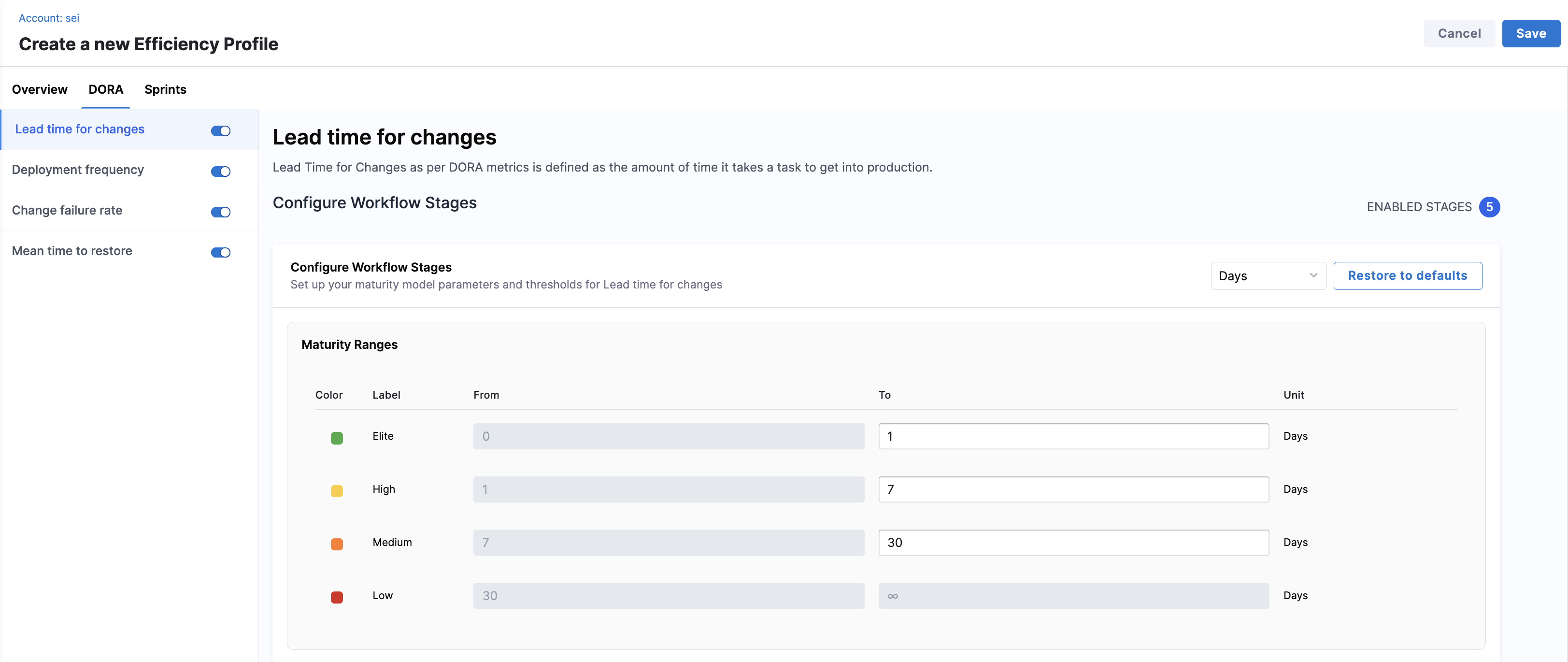 Navigate to the DORA and Sprints tabs to configure the individual metrics for the profile: