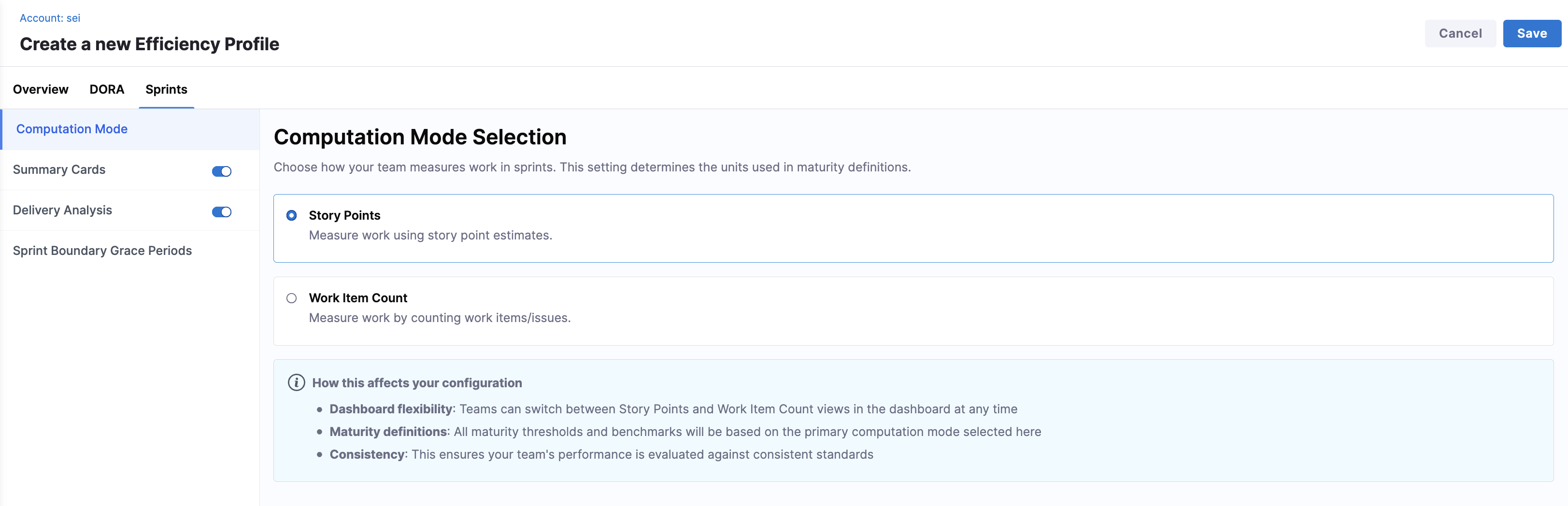 In addition to DORA metrics, Efficiency Profiles also define how sprint metrics are calculated and reported across your organization. Sprint configuration controls how work is measured, analyzed, and displayed for sprint-based delivery insights.