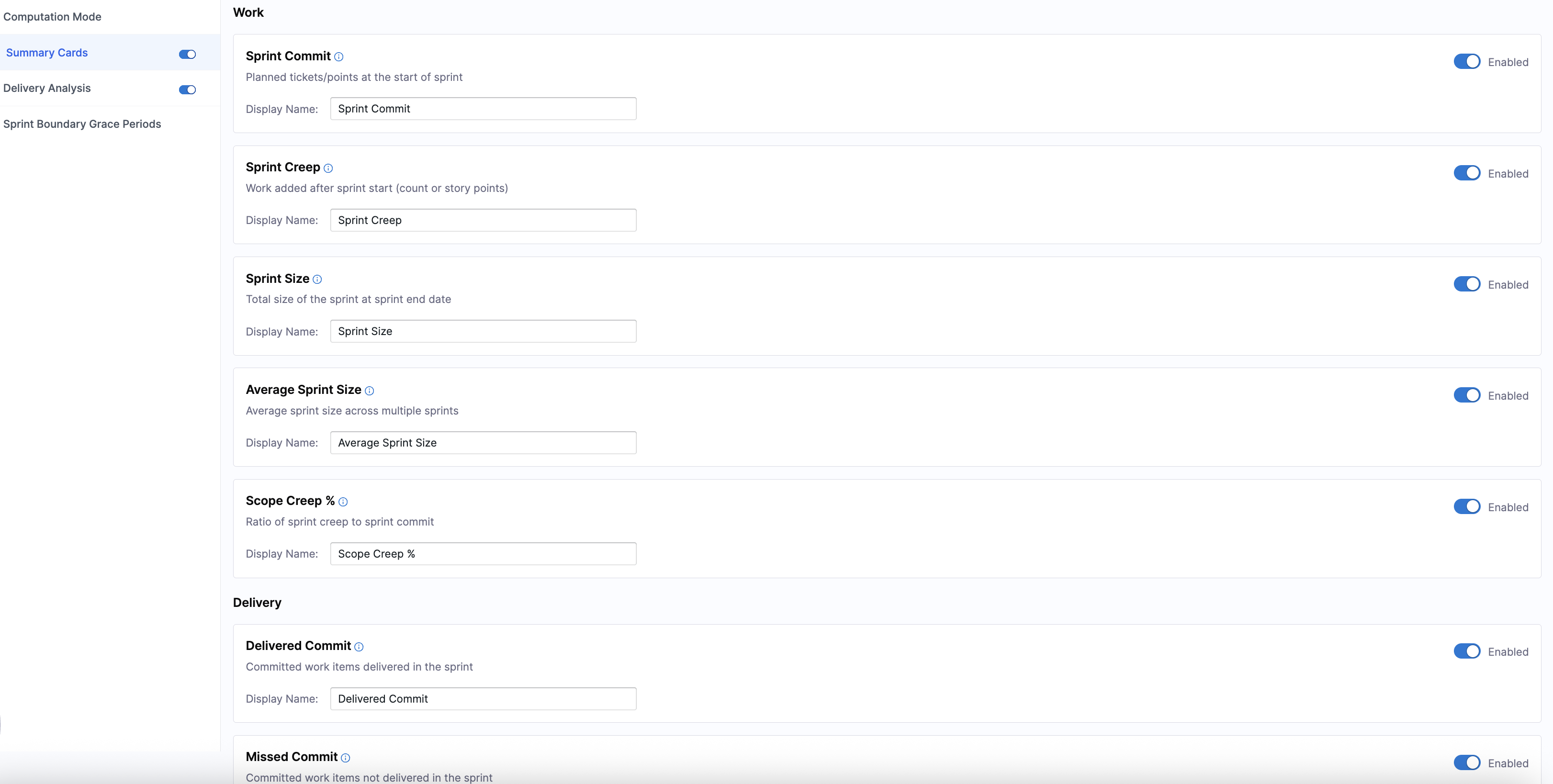 Summary Cards control which sprint metrics appear in sprint dashboards.