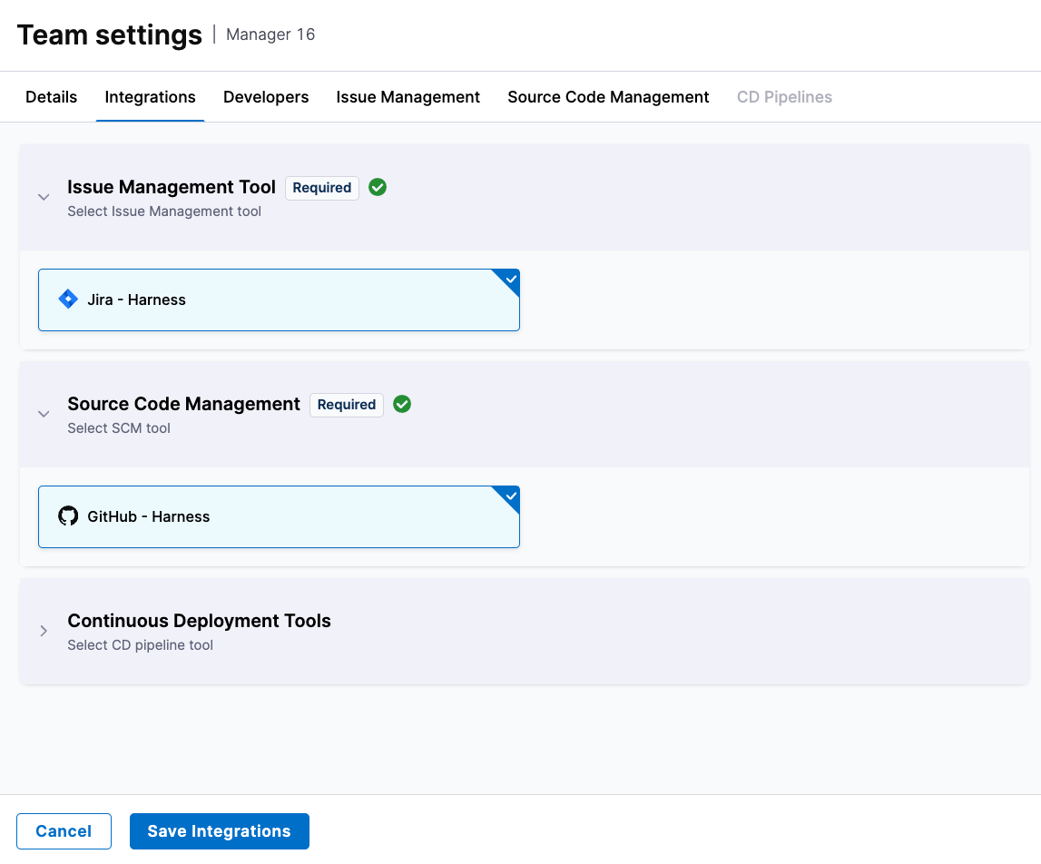Only the tools associated with the team’s linked Efficiency or Business Alignment profile will require configuration. Each team can override global settings to use specific integrations that better reflect their actual tool usage.