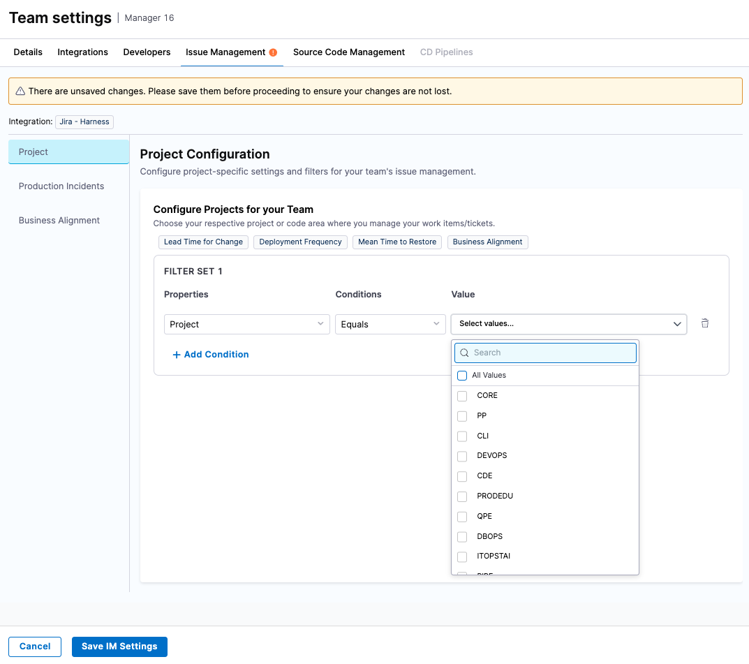 To calculate Change Failure Rate and MTTR, Harness SEI needs to know which work items represent failures or incidents. Define this using: