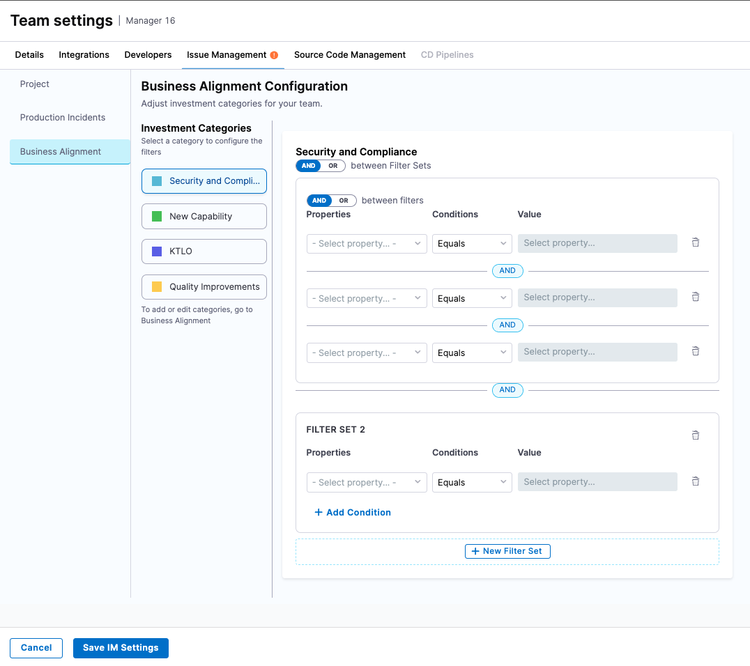 Business Alignment categories (e.g., Strategic Work, Tech Debt, Customer Commitments) are centrally defined by the Harness SEI Admin in the profile and apply across the organization. Teams configure how to filter work items into these categories using their own logic.