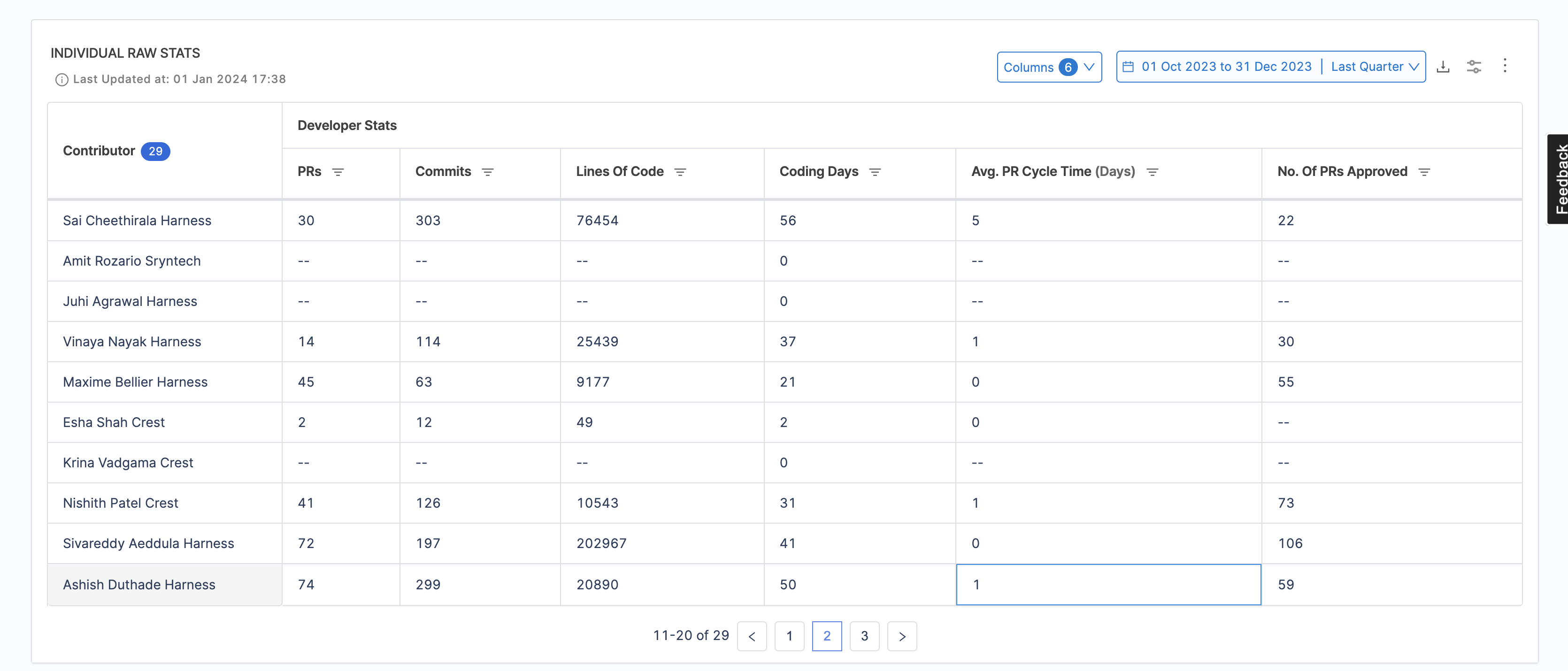 • Leadership and Collaboration: Leadership and collaboration measures developer teamwork and contribution to peer reviews.
